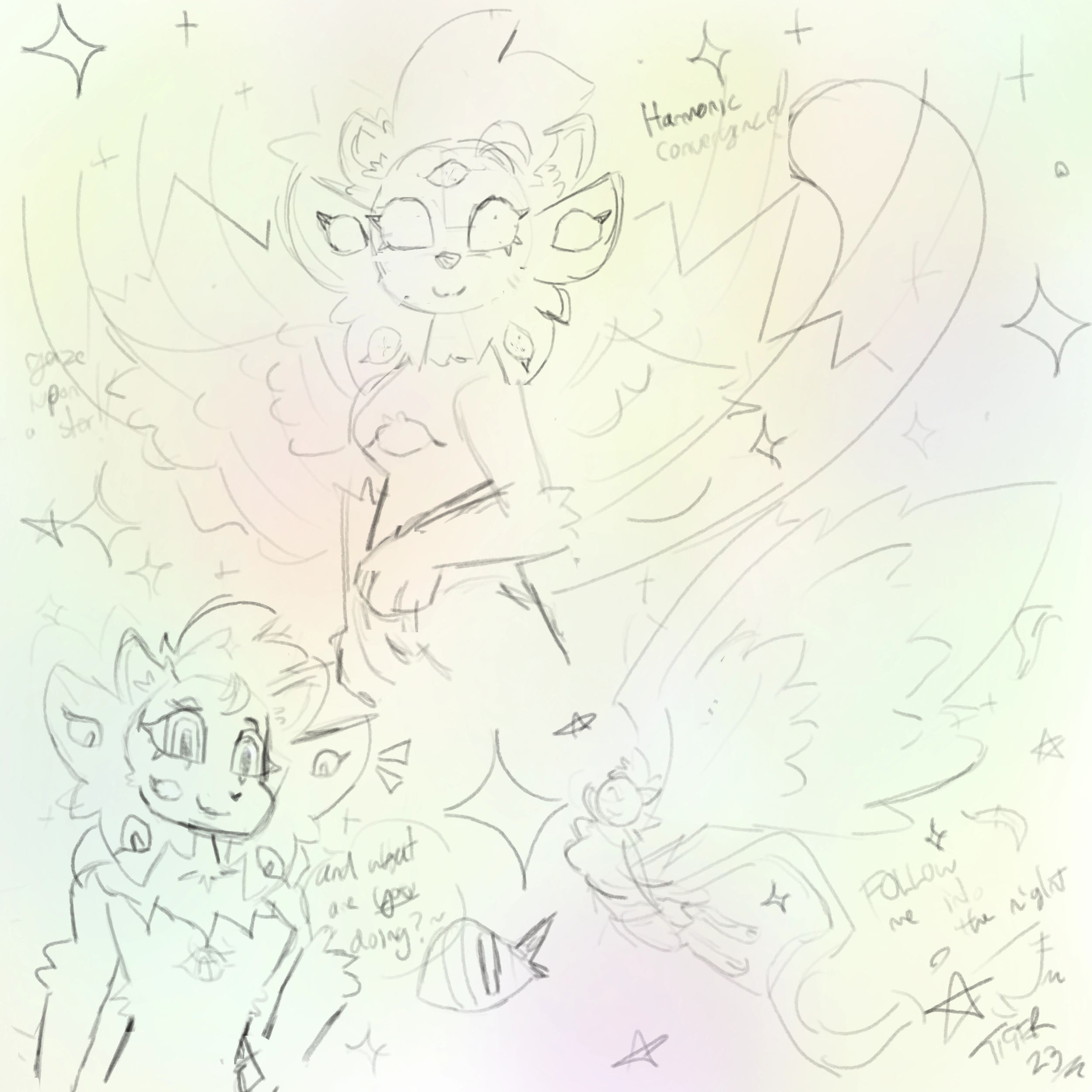 The rest of the image is decorated with pictures of eyes, sparkles, stars, and text reading "harmonic convergence", "gaze upon a star" and "follow me into the night".