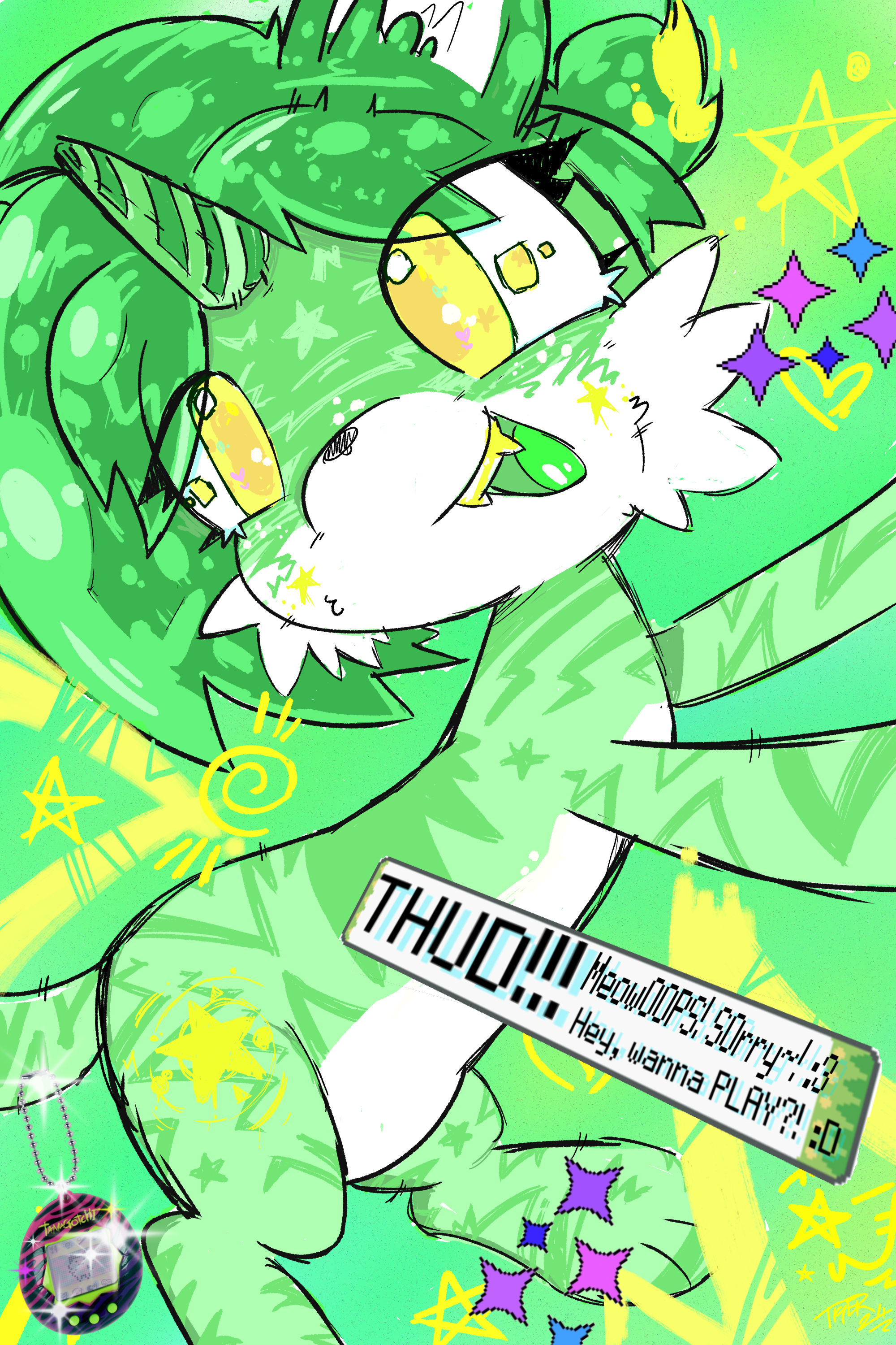 A sketch drawing of Tiger, in a more MLP pony proportioned form. She has a bright happy face with a "cutie mark" on her hip that is like a yellow star surrounded by swirls. There's a PNG of a tamagotchi and sparkles surrounding her.