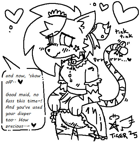 An MS-Paint picture of Tiger, wearing a maid's outfit and a diaper, lifting up her skirt to show off her wet diaper. She has a wobbly smile and blushing, shy expression. She has a collar with a bell on it on her neck, as well as a bow with a bell on it on her tail, and her mane is done up into a ponytail behind her head with a bow. She is purring, and her diaper is slightly sagging.