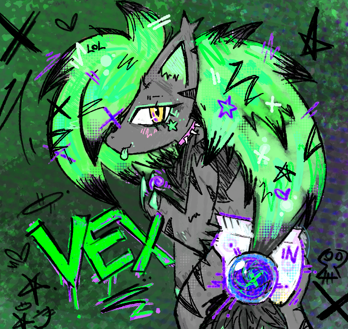 A picture of Vex the Zoroark, looking back over his shoulder towards the camera. She is wearing a diaper with poke-ball symbols on it, while slouched and smiling - her tongue poking out. She wears a spiked pink collar, and has gold yellow eyes. Her fur is gray with deep gray-black stripes, and her mane is a thick messy green with black tips. The word "VEX" in bright bold dripping letters is beside her.