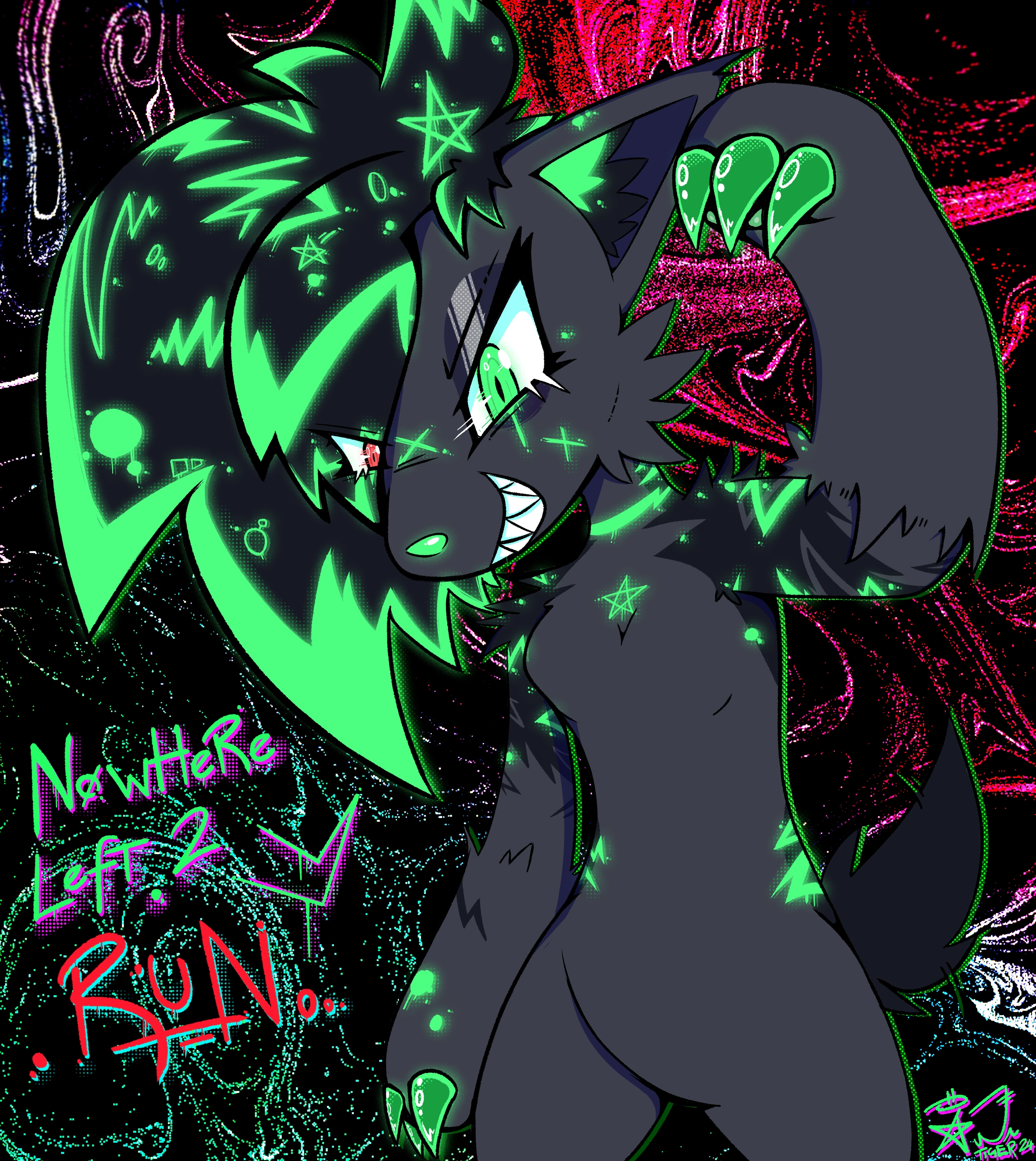 An image of Vex - a wolf-tiger-Zoroark with gray and dark gray markings, some like tiger stripes. She has glowing green claws, as well as glowing green paint-like markings shaped like tiger stripes on her arms and her hips. Her black mane is also heavily decorated with these glowing green markings in all kinds of shapes. She has heterochromatic eyes - one green, the other through her mane red. She has one claw raised above her head, with a teethy smile expression.