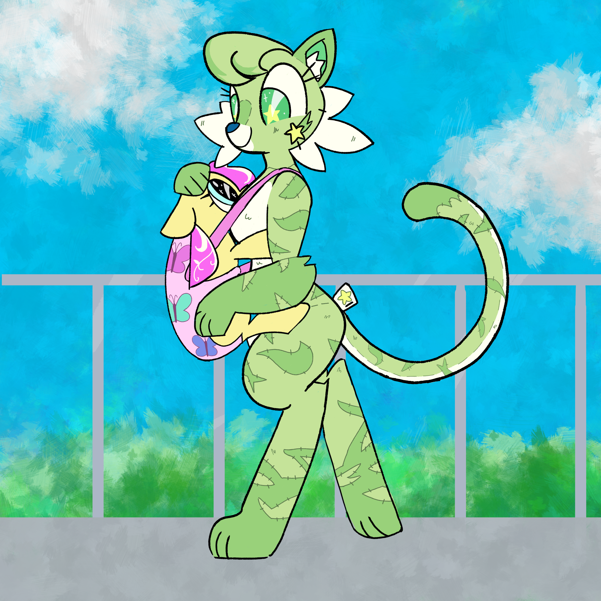 A picture of Tiger, walking outside, with Silky in a baby carrier against her chest. Tiger is smiling, a paw patting silky's head and another cradling her flank while she looks down at Silky. Silky is resting her muzzle against Tiger's bosom, staring up at Tiger with bright wide shiny eyes. The enviroment is a simple gray path with a railing, with a blue sky and greenery made of layered brush strokes.