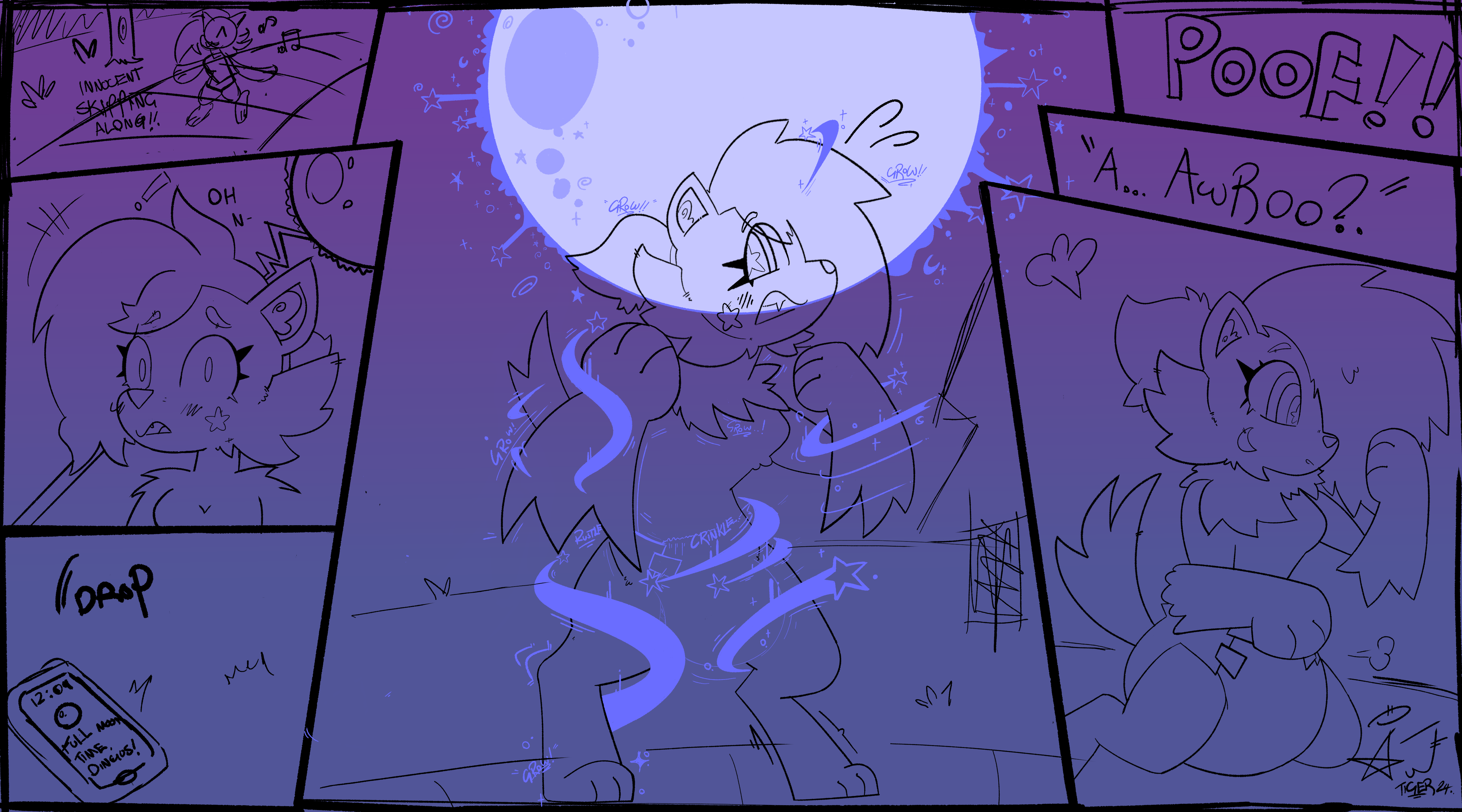 Panel 7 shows the aftermeath of the transformation, as Tiger (now a werewolf) looks at her own new big paw as she sits on the ground, her mane now thick and her star cheeks replaced with crescents. She also has a shorter wolf tail and a diaper.