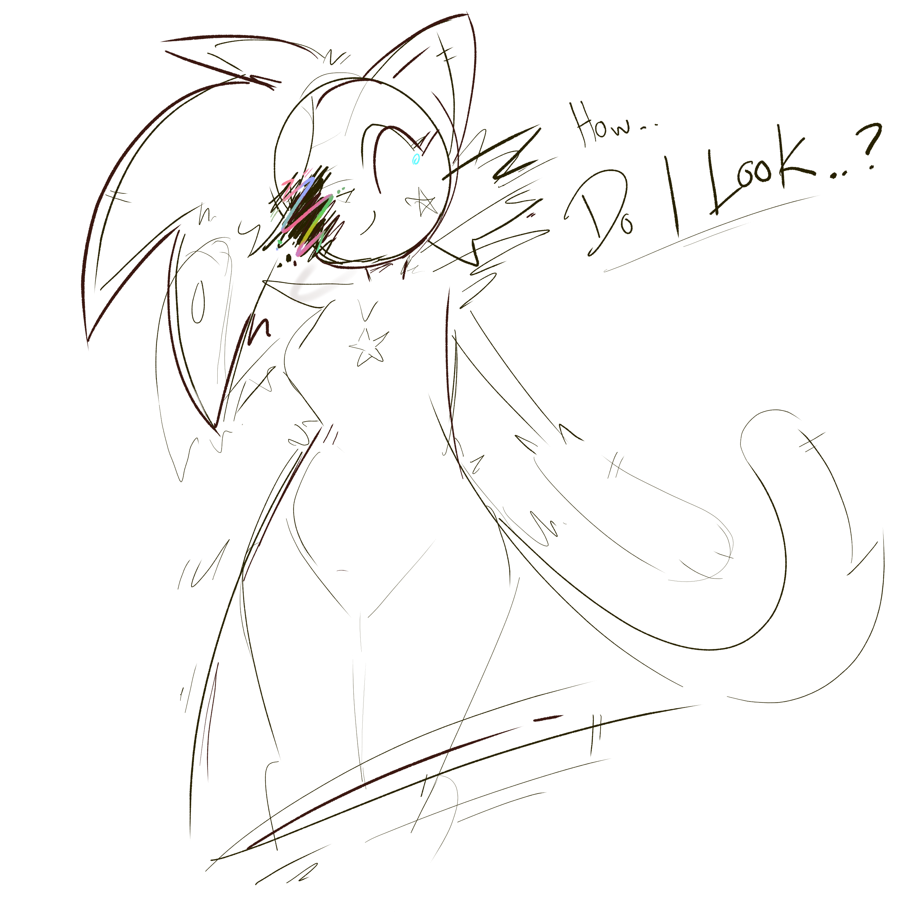 A sketch of Tiger, wearing some kind of transparent dress. She has a blacked out eye leaking rainbows, while her other is slightly teary. She is smiling, and asks, "How.. Do I look..?".