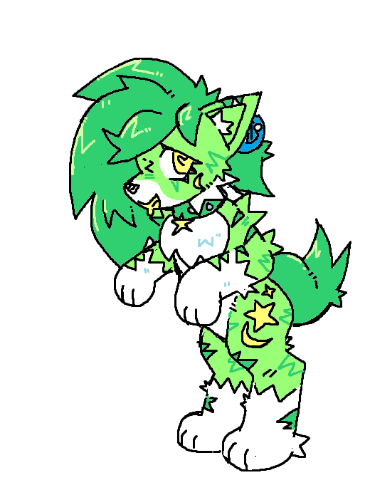 An MS-Paint picture of Tiger, as a werewolf. Her body is generally thicker and floofier, with her white paw "socks" stretching to cover more of her fores and hinds. Her mane has grown thick, and her tail is now thick and short. She is drooling with a heart eyed expression, with a more lupine head. A star and crescent and sparkle mark is on her thigh."