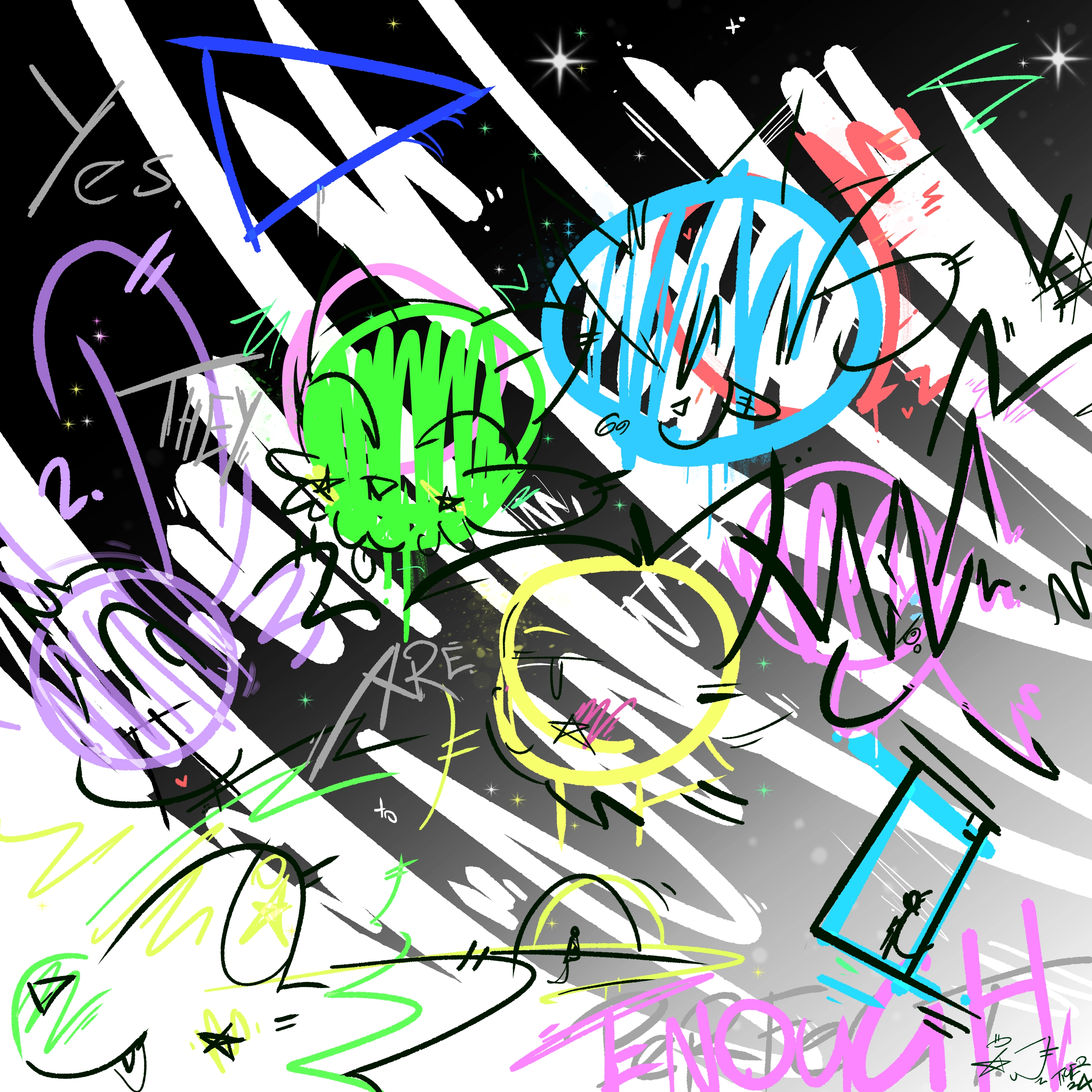 A picture of Tiger's mind unravelling, letting loose sketches of loose color and simple lines of various expressions and characters. There's a vague starry background, and the words "Yes, they are ENOUGH" faintly in the background..